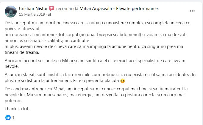 Sebi a venit la mine pentru a-şi rezolva durerile de spate, iar acum a devenit din ce în ce mai îndrăgostit de activităţile fizice (între timp, a convins-o şi pe iubita lui să vină la antrenamente şi se antrenează separat şi împreună)